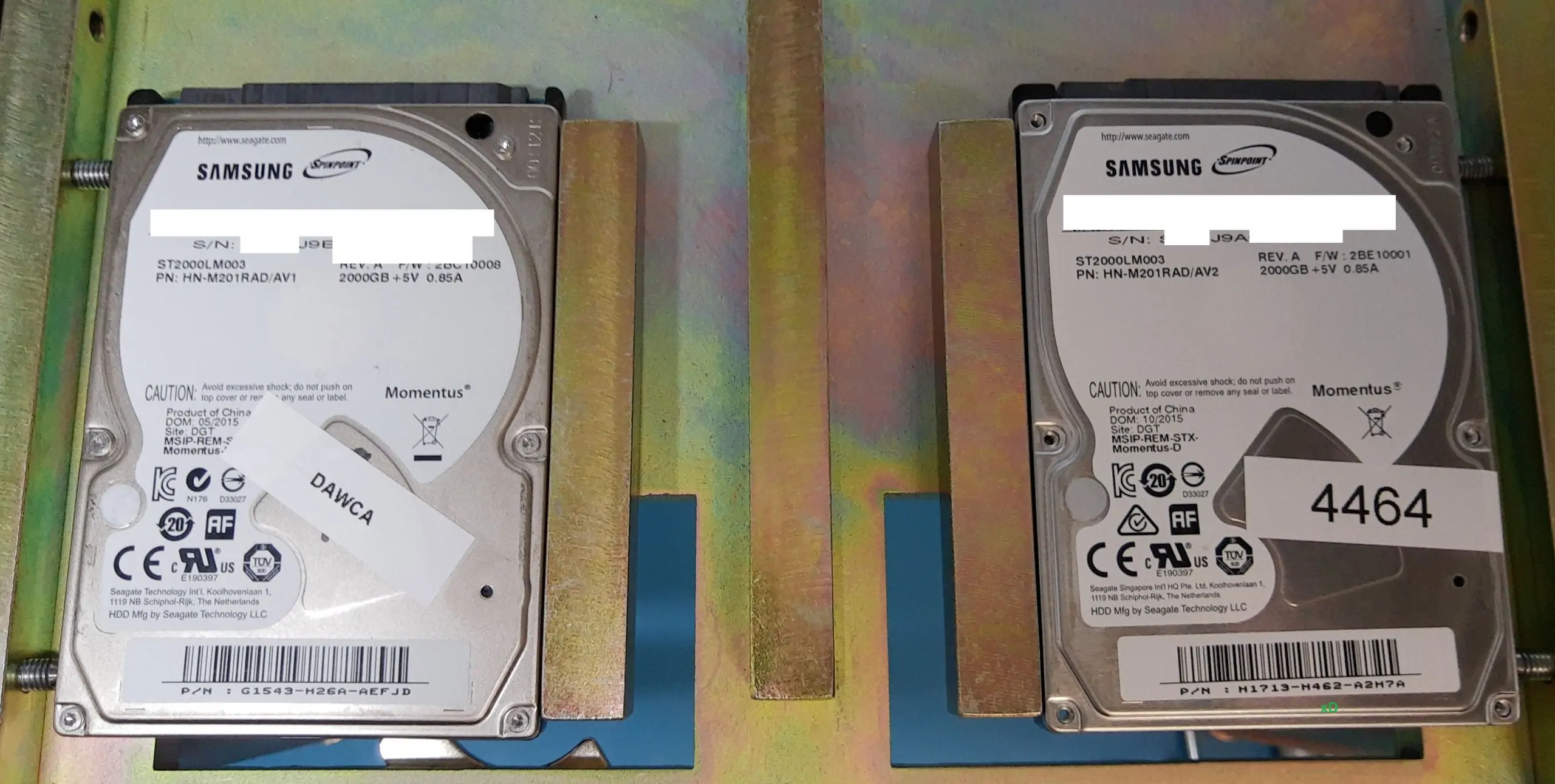 Dysk najprawdopodobniej upadł lub został czymś przygnieciony. Na plastikowej obudowie zewnętrznej od Seagate nie było widać śladu fizycznych uszkodzeń. Pozostało znaleźć dysk dawce części, tak się złożyło, że mamy takie dyski pod ręką. Pomyślałem, że mógłbym zrobić o tym wpis – stąd brak paru zdjęć z początku diagnozy. Z dawcy przełożyłem głowicę, podmieniłem pokrywę na wolną od wgnieceń.